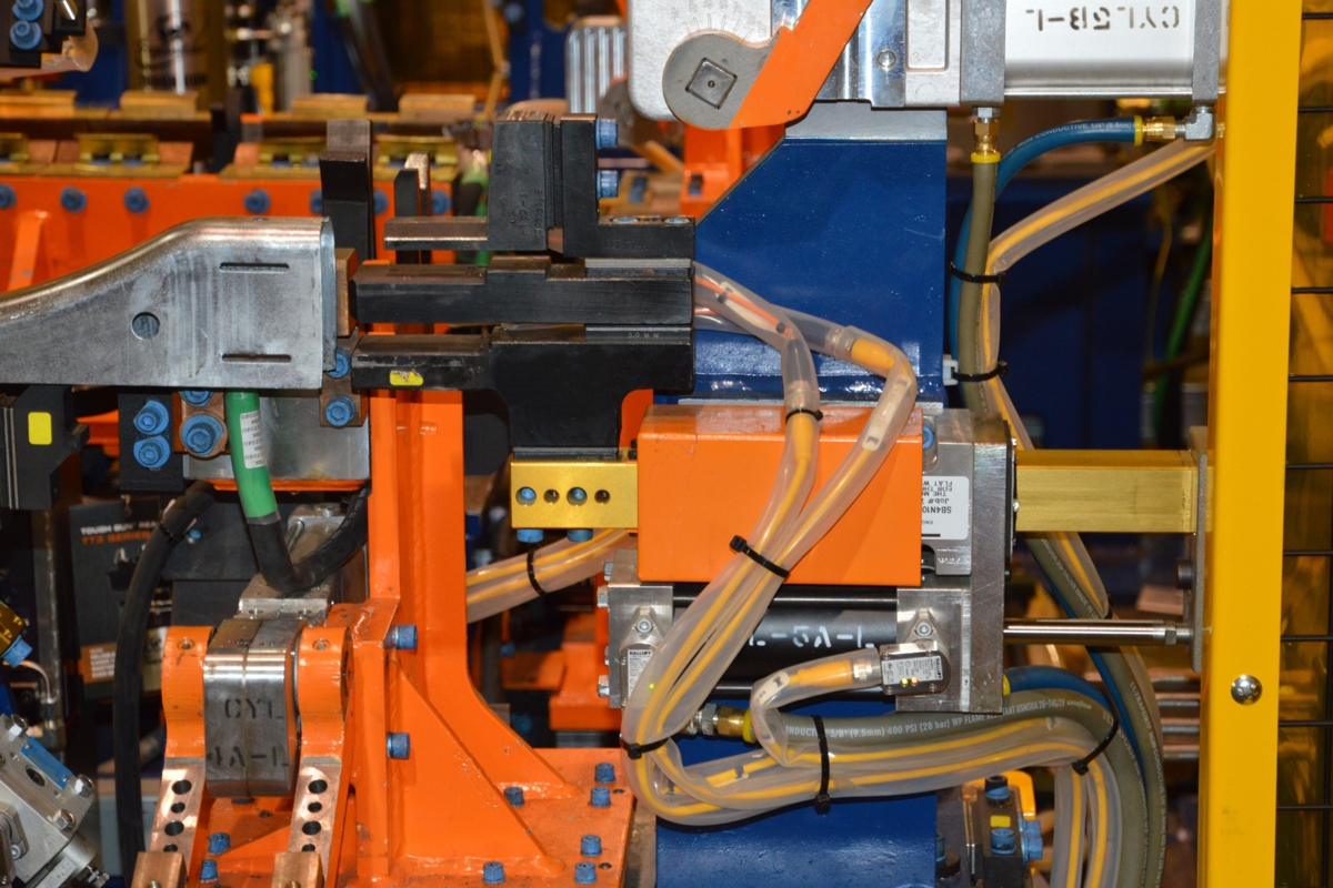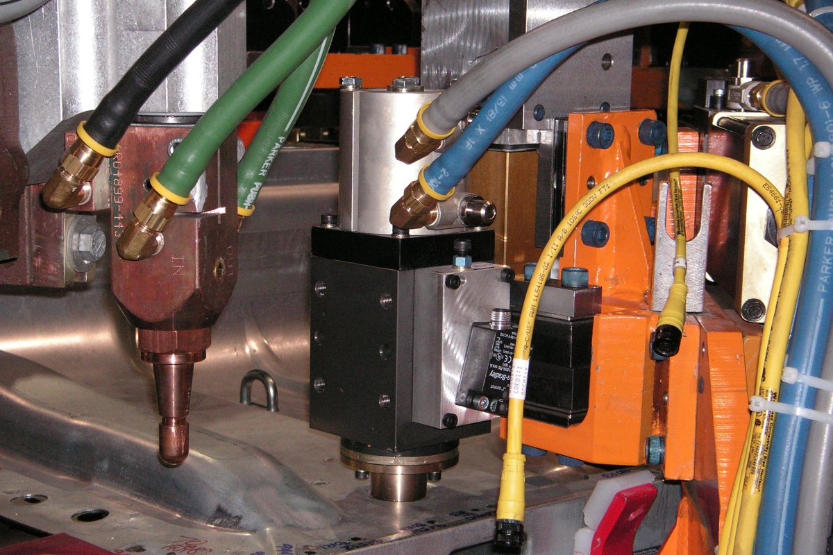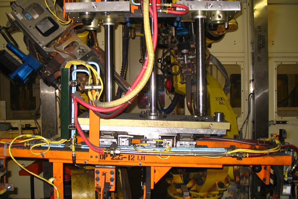On robot end effector in weld cell